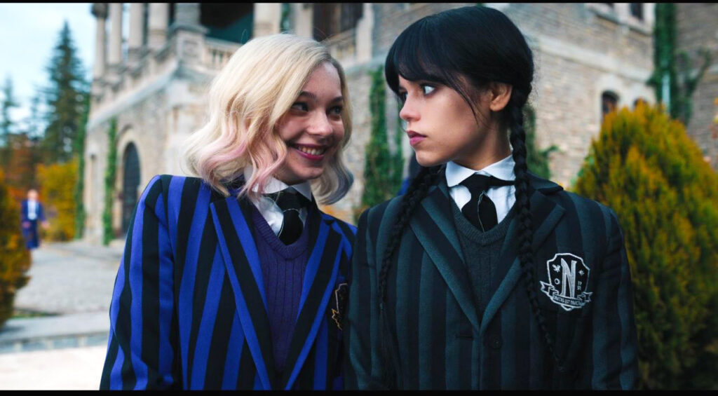 Wednesday herself is calm, observant, and emotionally guarded. Her roommate Enid is the opposite: bright, talkative, and desperate for connection. Their contrast gives the show warmth and humor. Other characters — teachers, classmates, and townspeople — fill out a world that feels playful on the surface, but often uneasy underneath.